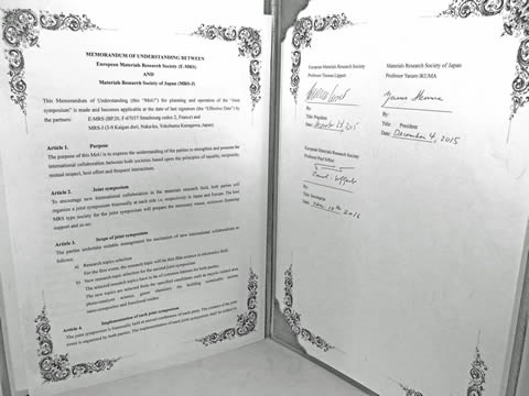 去る2015年12月、日本MRS(会長:伊熊泰郎 神奈川工科大学教授)は、E-MRS(会長:Thomas Lippert教授 Paul Scherrer Institute、スイス) と、それぞれの年次大会で交互に、ジョイント・シンポジウムを企画・開催することを通して、両MRSの一層の連携強化と、国際共同研究の 活発化を目的に、覚書を締結した。