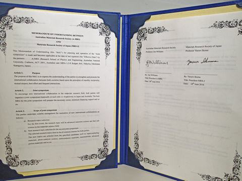 去る2016年6月、日本MRS(会長:伊熊泰郎 神奈川工科大学教授)は、Australian-MRS(会長:Jim Whiliams教授 オーストラリア国立大学、オーストラリア)と、それぞれの国で交互に、ジョイント・シンポジウムを企画・開催することを通して、両MRSの一層の連携強化と、国際共同研究の 活発化をはかることを目的に、覚書(MoU)を締結した。